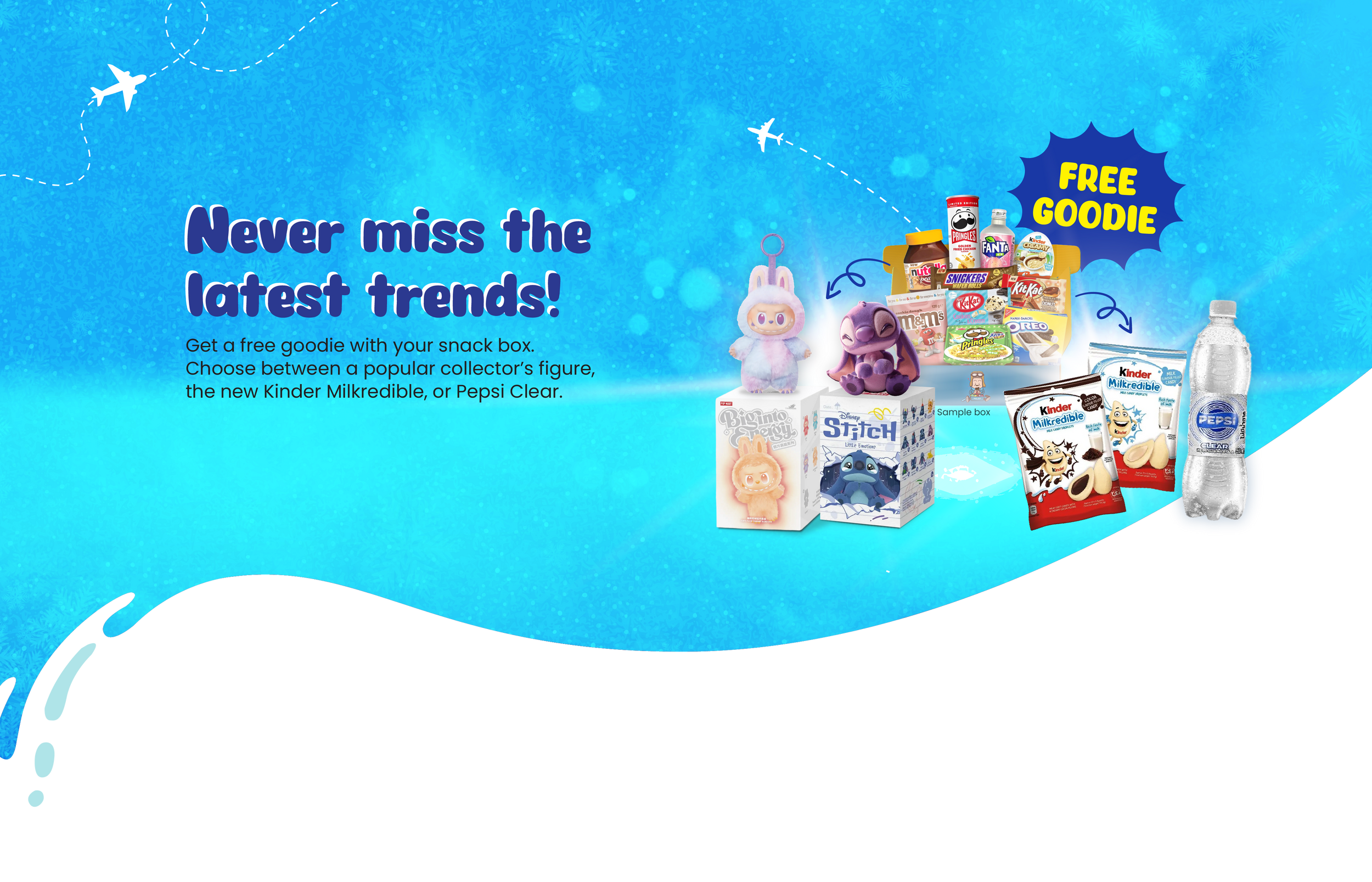 Hanki kuukausittaiset välipalat eri puolilta maailmaa. Joka kuukausi uusi maa, uusia välipaloja ja uusi maukas seikkailu eksklusiivisista tuotteista, joita et lÜydä helposti paikallisesta kaupasta.